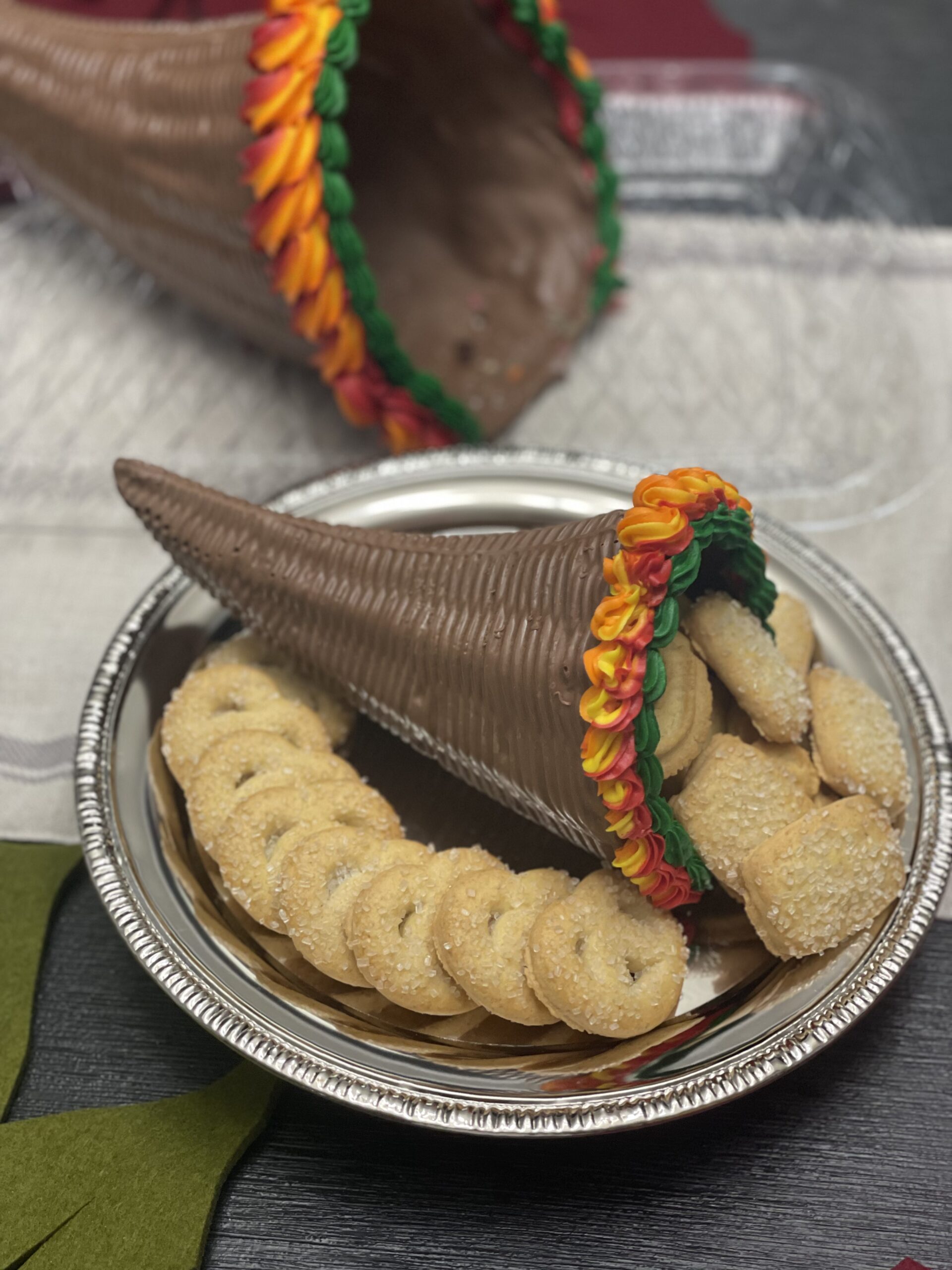 Beautifully decorated chocolate chip cornucopia filled with an assortment of 12-15 cookies and brownie bites. Varieties include Oatmeal Raisin, Snickerdoodles, and Specialty cookies (M&M, Red Velvet, etc.)